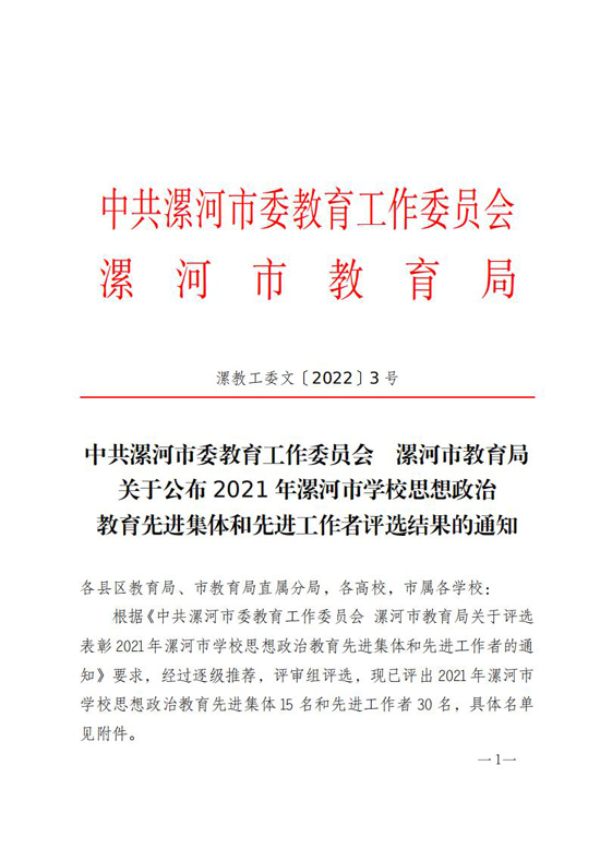 2022/02/17思政部王含同志獲得2021年漯河市學校思想政治先進工作者