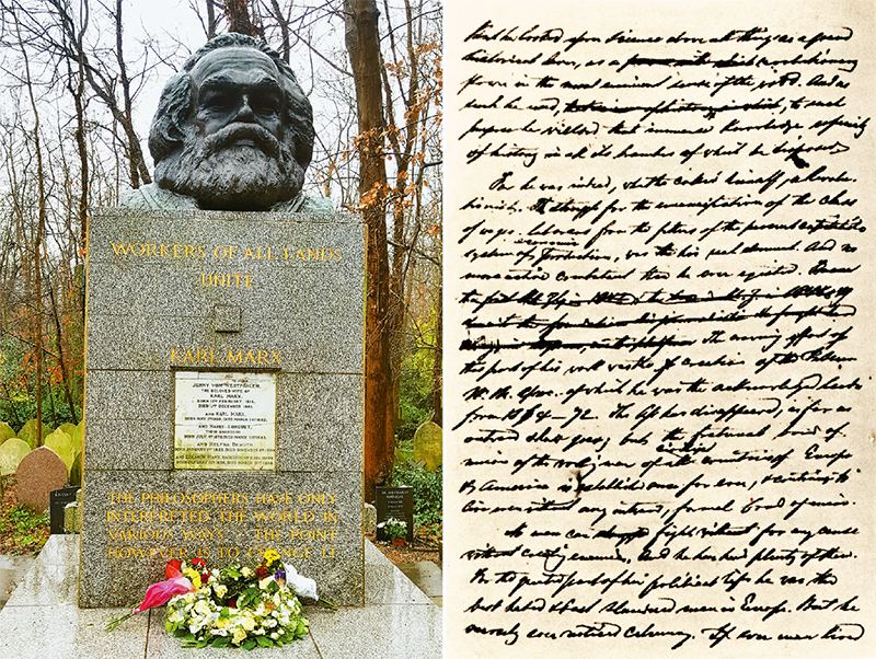 1883年3月17日,恩格斯在馬克思墓前的講話中,高度評價了馬克思的偉大一生、科學貢獻和崇高品格,并對歷史唯物主義的基本內涵作出了精辟闡發。恩格斯指出,唯物史觀和剩余價值學說是馬克思的兩個偉大發現,正是這兩個偉大發現,使社會主義從空想變成了科學;強調馬克思主義具有強大的生命力,如果沒有馬克思主義,人類即便不是“在黑暗中摸索”,也不可能在整體上達到目前的水平。左圖是英國倫敦海格特公墓中的馬克思墓,右圖是恩格斯寫的馬克思墓前悼詞草稿第2頁。 張遠航供圖