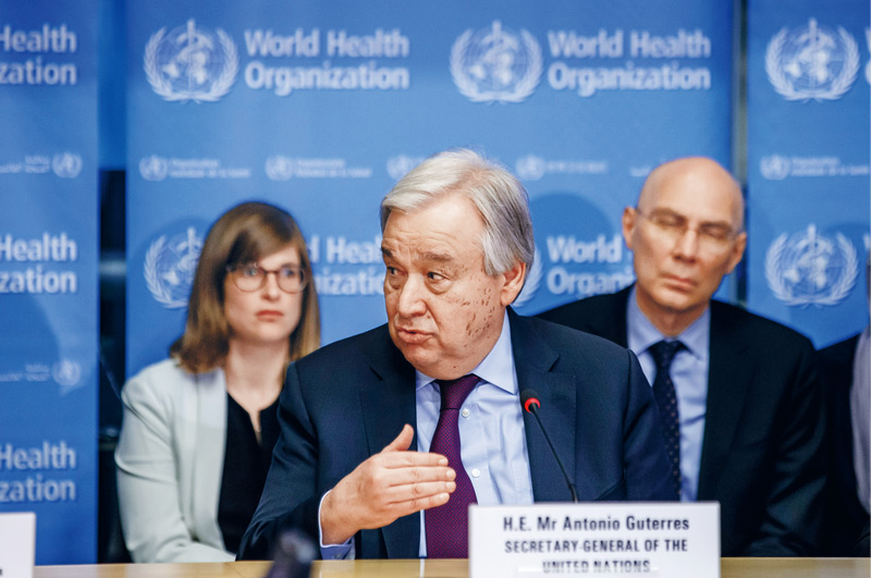 2020年2月24日,聯合國秘書長古特雷斯(前)在瑞士日內瓦世界衛生組織總部發表講話。古特雷斯表示,中國實施嚴格的防控措施,以犧牲正常生活的方式為全人類作出了貢獻。古特雷斯當日造訪日內瓦世衛組織總部,并與世衛組織各部門負責人舉行座談。 新華社發