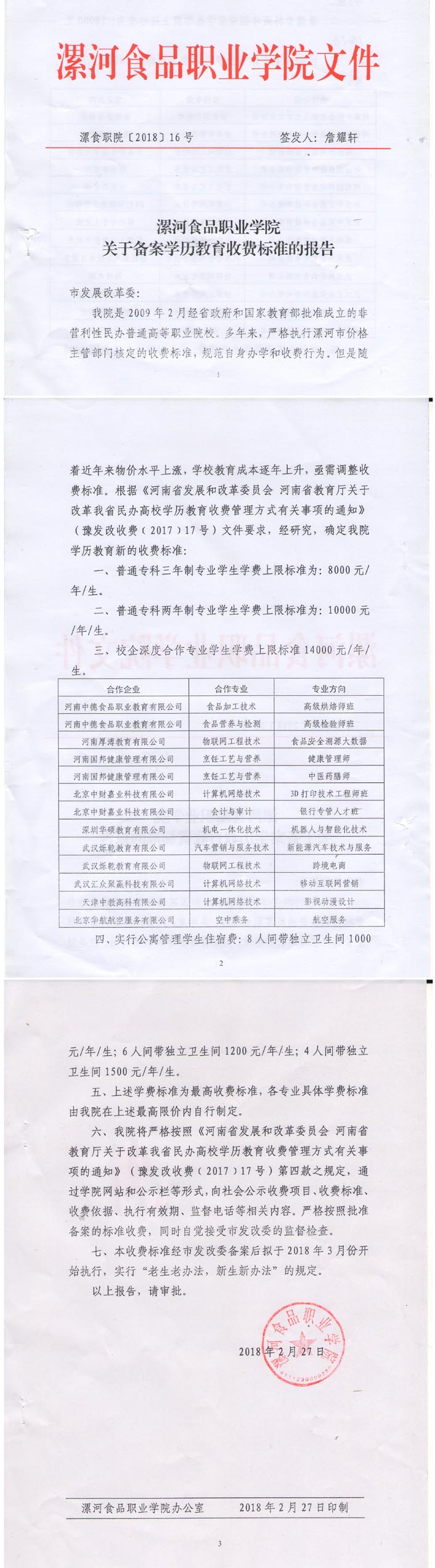 漯河食品職業(yè)學(xué)院2018年收費標準公示